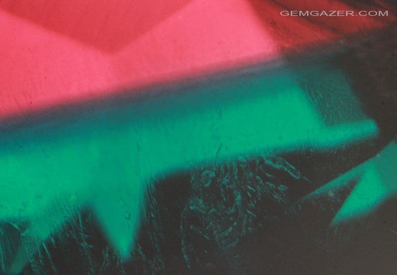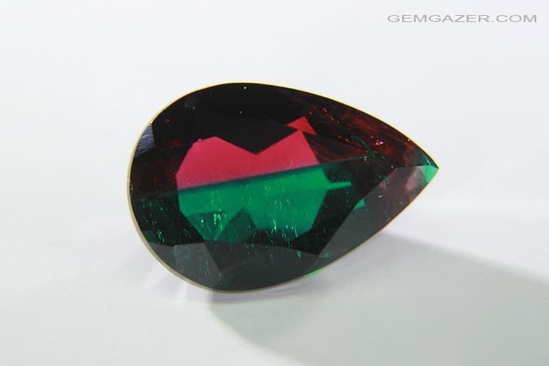 The gem is a single hydrothermal growth synthetic Beryl, with approximately half of the stone a vibrant green colour and the other half a bright red.