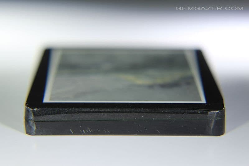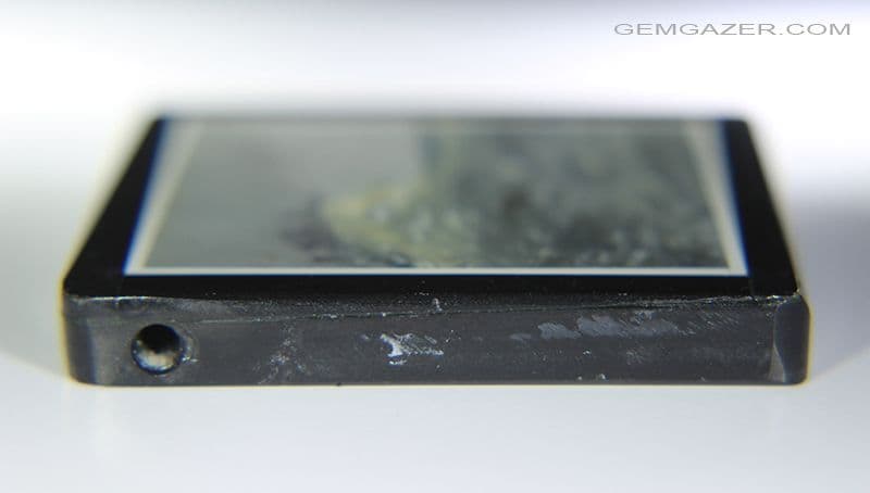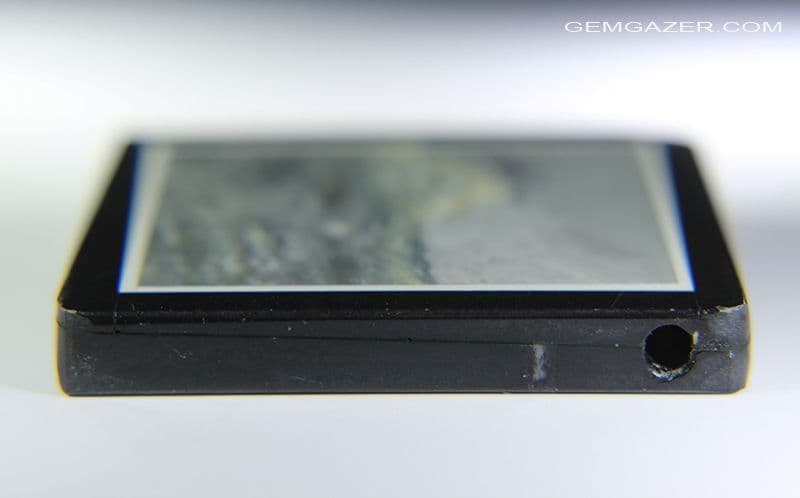 The intarsia has a drill hole at the top which runs through the side of the gem.