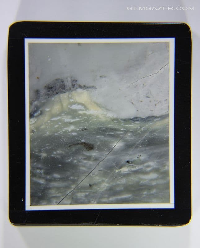 The muted colours of the Jasper form a stormy sea or mist-shrouded mountain scene in shades of grey, white and pale yellow and are framed within a white Agate border.