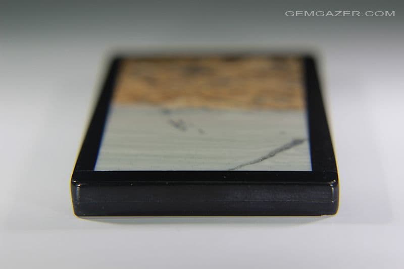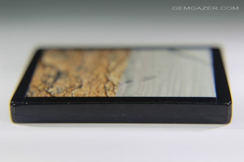 The gem is composed of three main components, a sandy-coloured banded slab of Royal Sahara Jasper from Africa below a slab of pale blue banded Ocean Wave Jasper from Madagascar, all bordered and backed in black Obsidian.