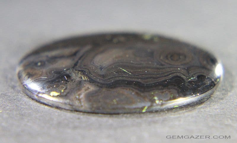 Psilomelane is a hydrous manganese oxide mineral. The finest examples are shaded black in colour with a banded appearance forming intricate patterns, with a bright sub-metallic lustre. This cabochon from Mexico displays these characteristics as well as having a segment of translucent colourless Agate at one end.