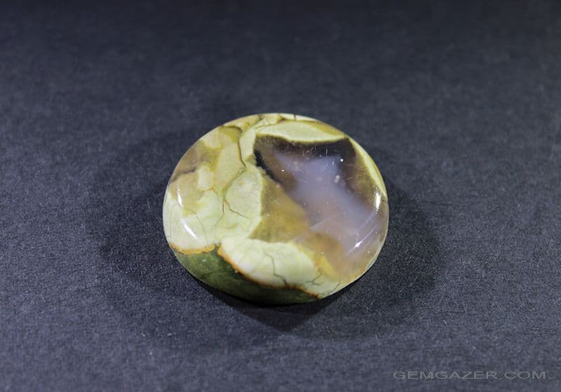 This striking cabochon has large semi-transparent colourless areas enclosed in a pale green shaded matrix.
