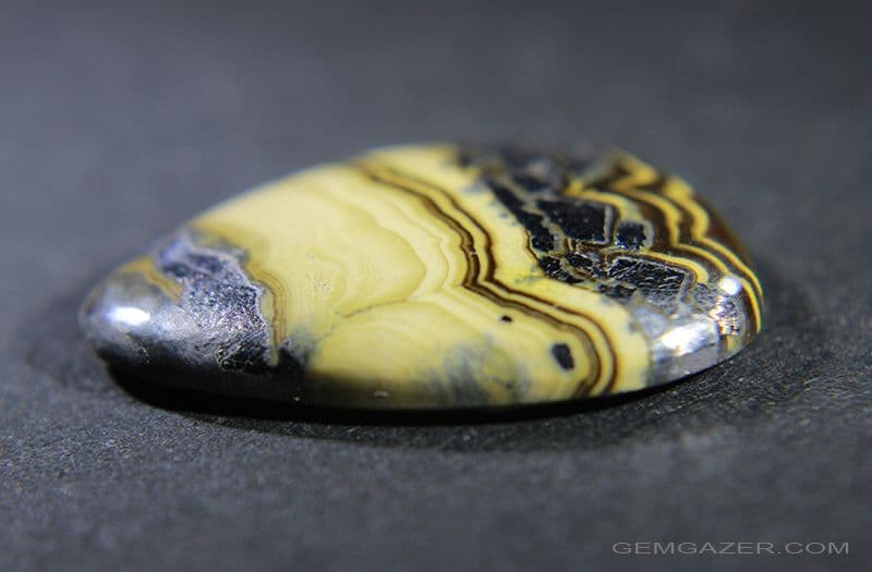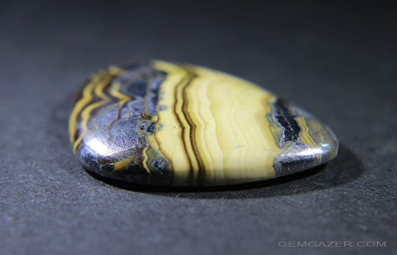 The mineral Schalenblende is a combination of Sphalerite, Wurtzite, Pyrite and Galena with a compact, banded structure. The pale yellow bands are punctuated with contrasting brown and cream layers and capped at each end of this cabochon with lustrous metallic crystalline Galina. An uncommon and very attractive gem.