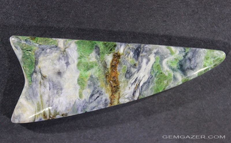 Smaragdite is an amphibole mineral, a member of the Actinolite family. This multicoloured cabochon is from the Swiss-Italian Alps.