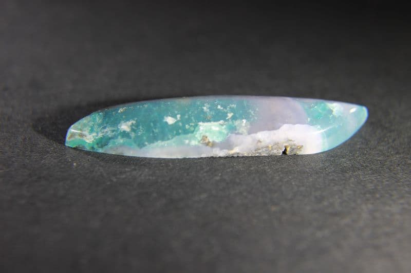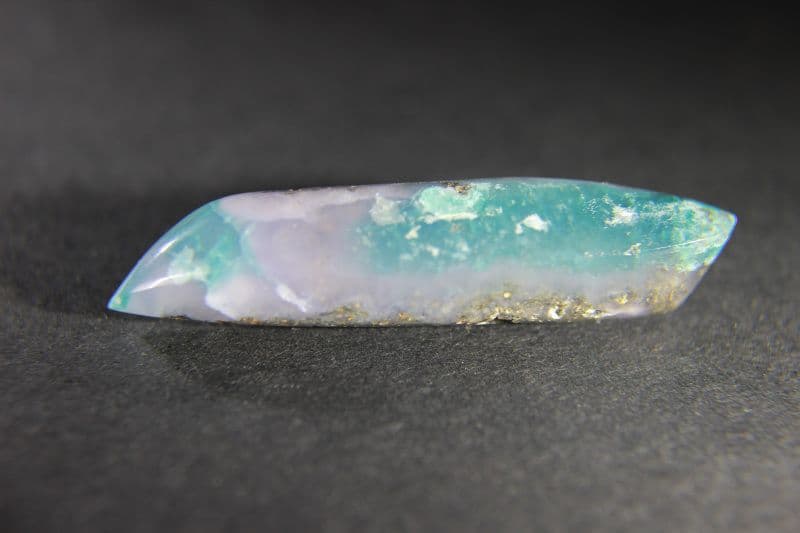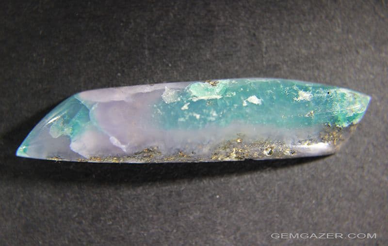 This translucent purple and teal-blue cabochon with black dendrites comes from Sinaloa, Mexico.