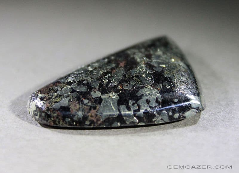 A cabochon of black Sphalerite with sub-mettalic lustre studded with flakes of golden metallic Pyrite from Santander, Spain.