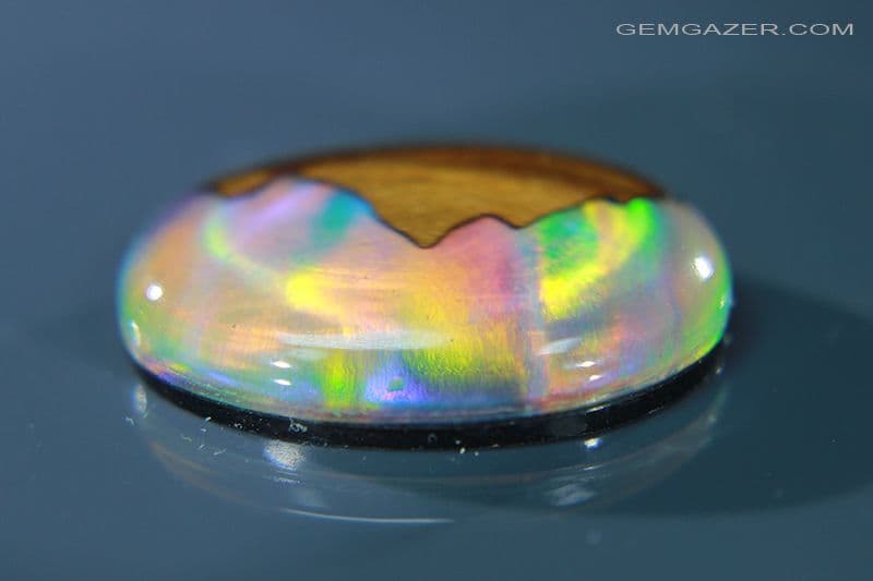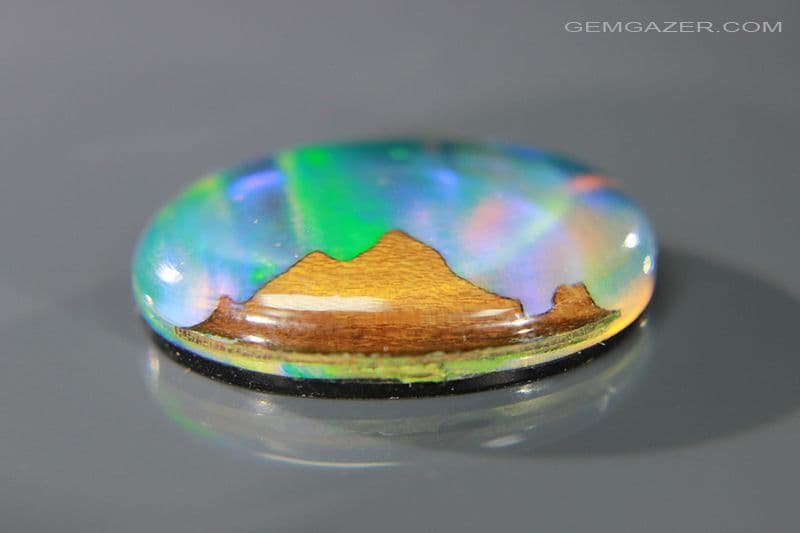 Synthetic Aurora Opal & Maple Wood Landscape Triplet cabochon, Australia. 30.44 carats. (Video)