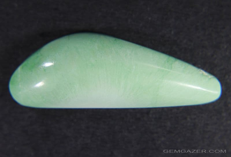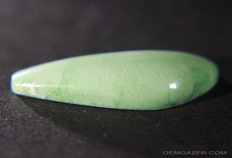 An attractive cabochon of Variscite from Lucin, Utah with shades of green and a banded, almost sagenitic structure.
